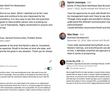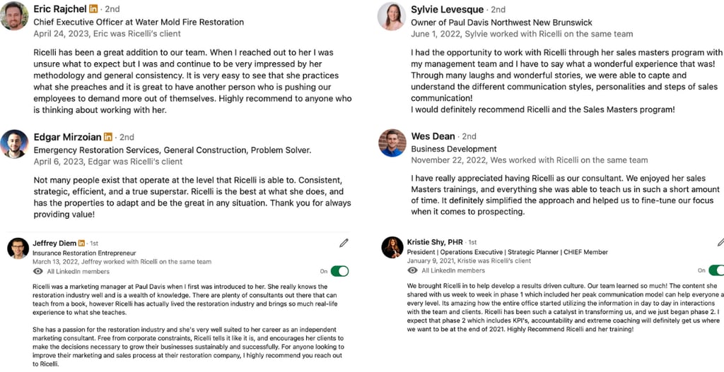 As a sales consultant, Ricelli has worked with some of the biggest names in the restoration industry, helping them to increase their sales revenue and improve their customer satisfaction ratings. Her proven track record of success has earned her a reputation as a trusted advisor and thought leader in the industry.